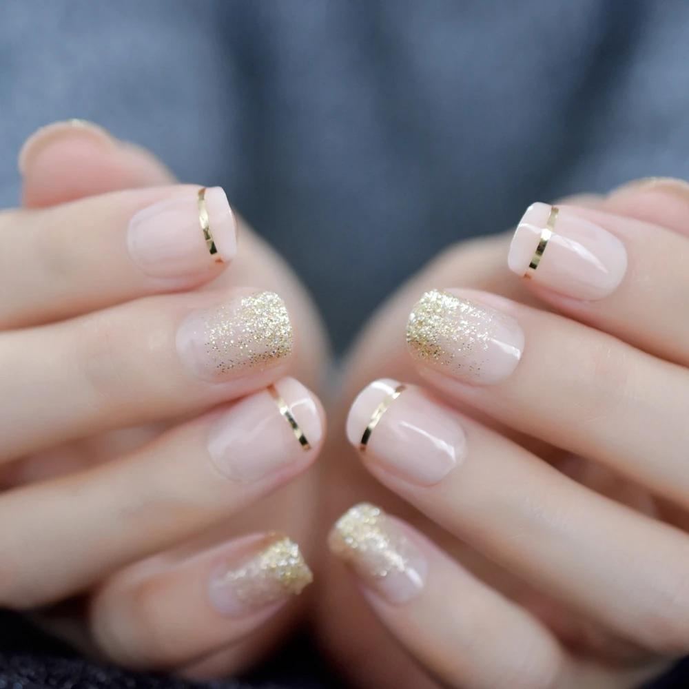 Short Glitter Natural False Nail Golden Rim Cute Elegant Pre